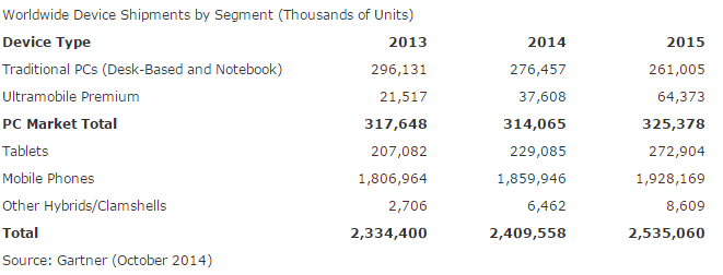 Gartner, 2014, Gartner Says Sales of Tablets Will Represent Less Than 10 Percent of All Devices in 2014, viewed 13 April 2015, http://www.gartner.com/newsroom/id/2875017]