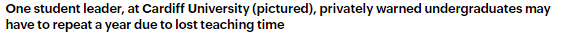 據(jù)英媒透露,卡迪夫大學(xué)的一名學(xué)生領(lǐng)袖私下警告道,由于損失的課時太多,有的本科生可能不得不重讀一年。