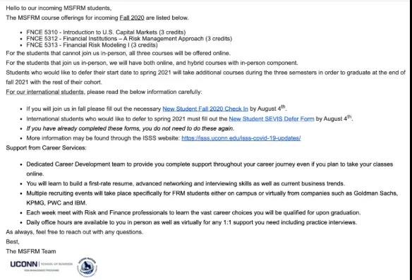 受到疫情的影響,很多學校為了便利學生,在開學之初就會郵件告知學生核心課程有哪些了。下圖就是康涅狄格大學給經(jīng)濟學研究生學生發(fā)送的郵件,學生可以清楚的看到核心課程的名稱、學分和課程代碼。
