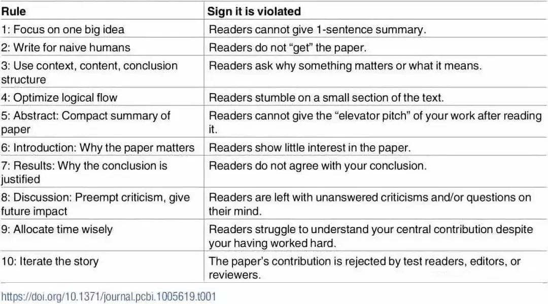 作為一個作者,如果你不能夠在幾分鐘之內(nèi)向你的同事描述出論文的整體大綱,那么很明顯讀者也無法做到。你需要進(jìn)一步提煉你的故事。找尋到此類違反優(yōu)秀寫作的行為對從各個層次提高論文質(zhì)量十分有益。