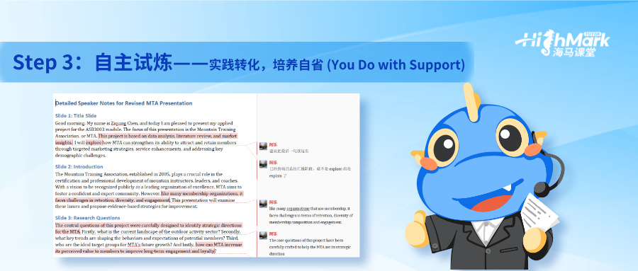 1.開始“放手”,引導(dǎo)獨立:讓學(xué)生嘗試自己完成部分內(nèi)容,如初稿、引用標注等;