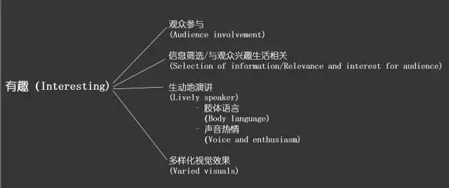 · 觀眾參與(Audience involvement):有互動(dòng)和交流,除了眼神交流,還可以通過(guò)提出或回答問(wèn)題與觀眾互動(dòng)