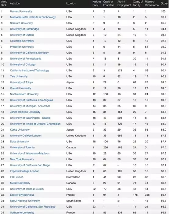 在本次榜單中,哈佛大學(xué)連續(xù)第八年被CWUR評為全球頂尖大學(xué)。麻省理工緊隨其后排名第二,斯坦福大學(xué)相較去年下降了一名,位居第三。世界十強(qiáng)中美國大學(xué)占據(jù)了八個席位。英國大學(xué)中劍橋 、牛津分別位列第四、第五位。